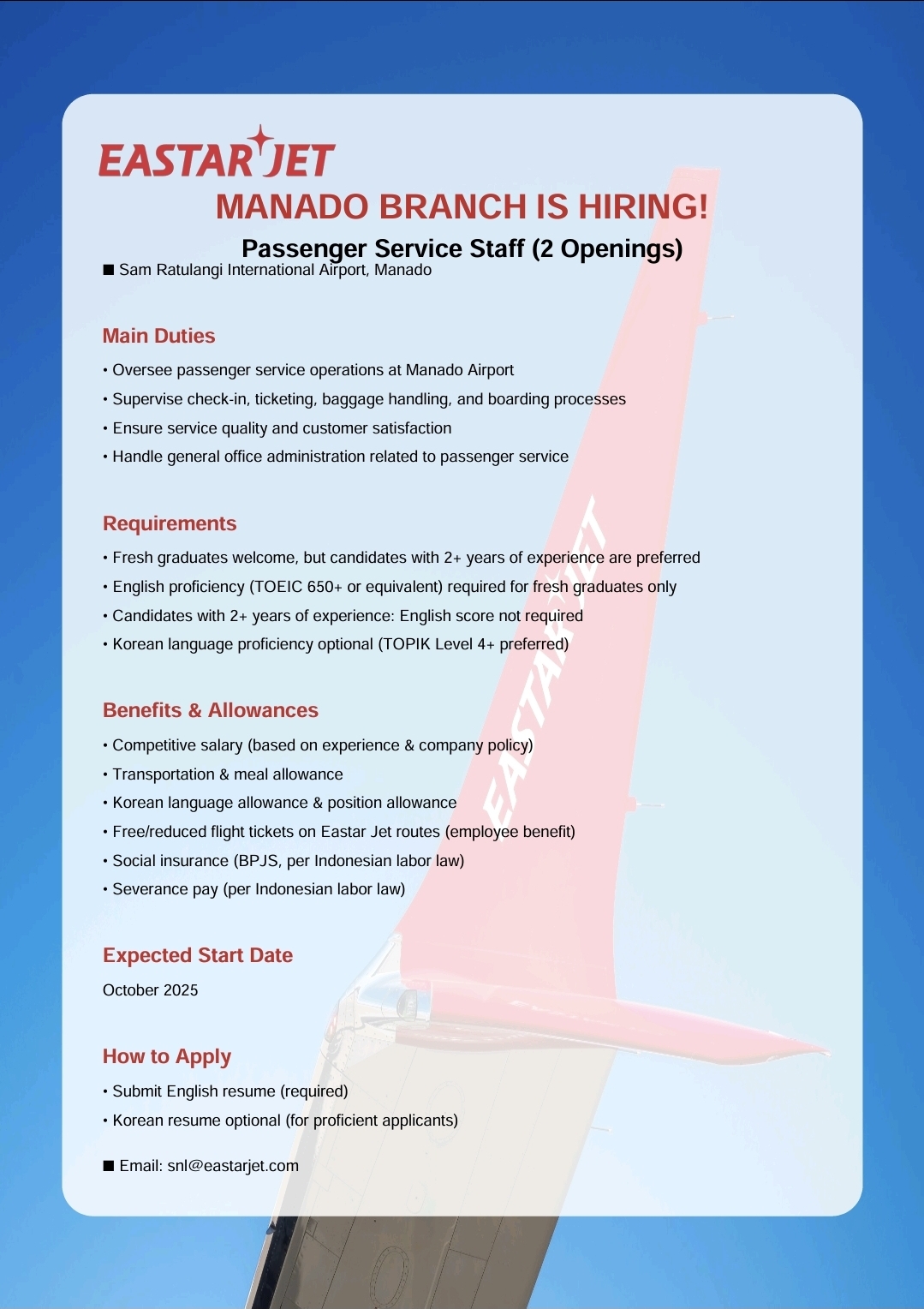 Seiring rute perdana tersebut, Eastar Jet membuka kesempatan berkarir sebagai Passenger Service Staff. “Saatnya wujudkan mimpi berkarir di maskapai penerbangan Korea dan raih kesempatan global,” tulis manajemen. (Redaksi)